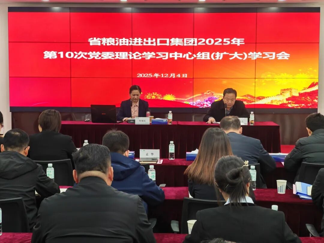 12月4日,省糧油進出口集團召開2025年第10次黨委理論學習中心組學習會,深入學習貫徹黨的二十屆四中全會精神,集團黨委書記、董事長孟華主持會議并講話,黨委副書記、總經理郝佳出席會議。
