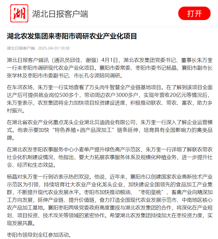 湖北日?qǐng)?bào):湖北農(nóng)發(fā)集團(tuán)來(lái)?xiàng)楆?yáng)市調(diào)研農(nóng)業(yè)產(chǎn)業(yè)化項(xiàng)目
