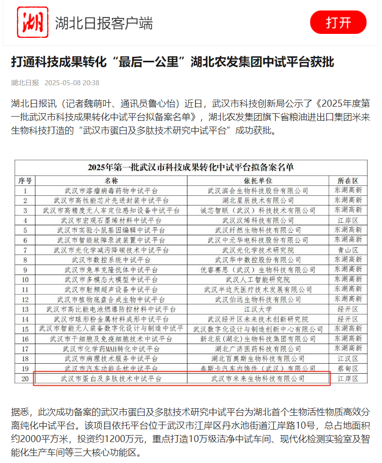 湖北日報:打通科技成果轉化“最后一公里”湖北農發集團中試平臺獲批